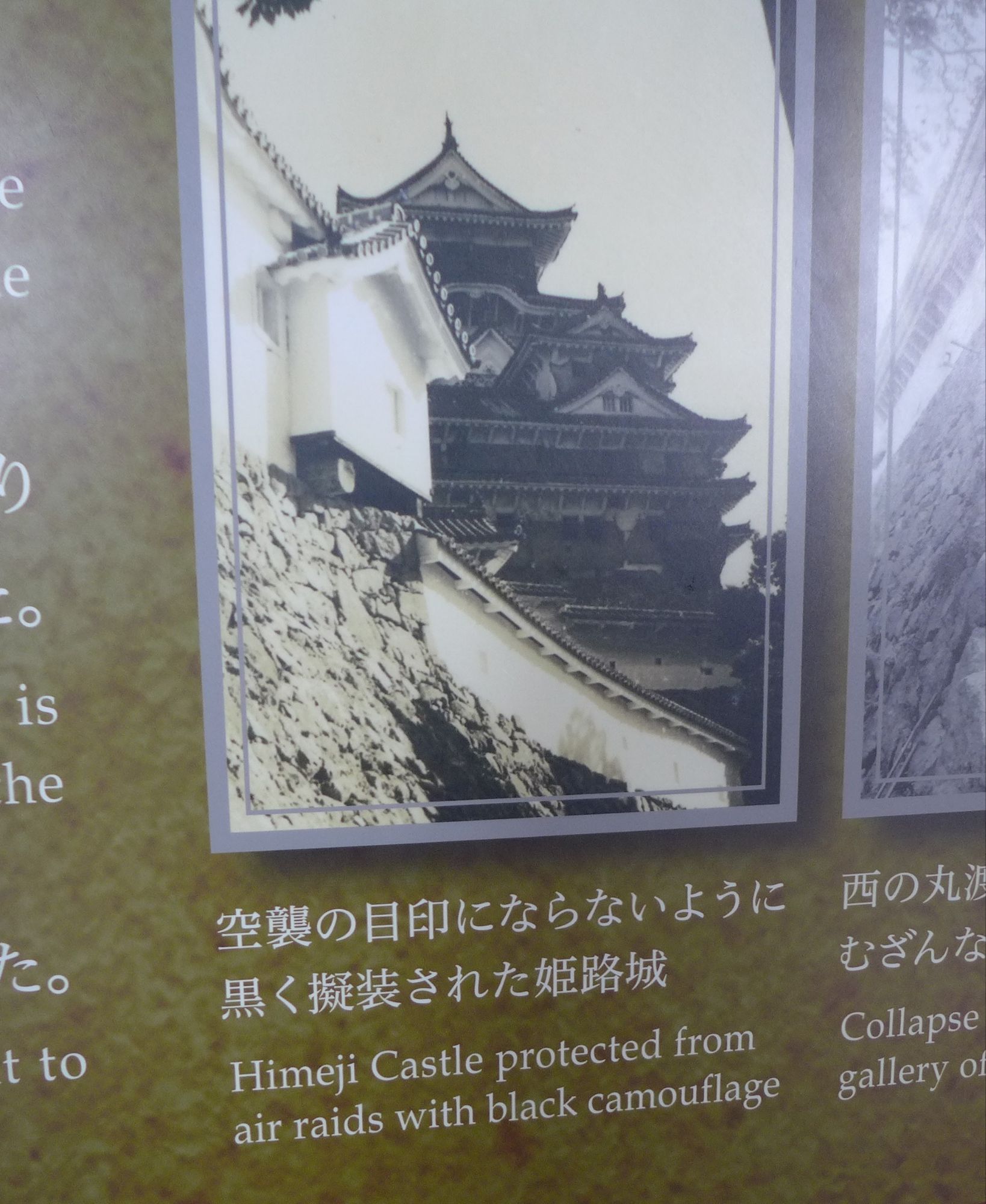 ある本の記述に、「城が高くそびえ天守や櫓の漆喰壁が白いので、来襲敵機の好目標になることをおそれ、昭和十七年五月に天守閣を、翌年十二月には諸櫓と土塀を偽装網でおおった」とあります。