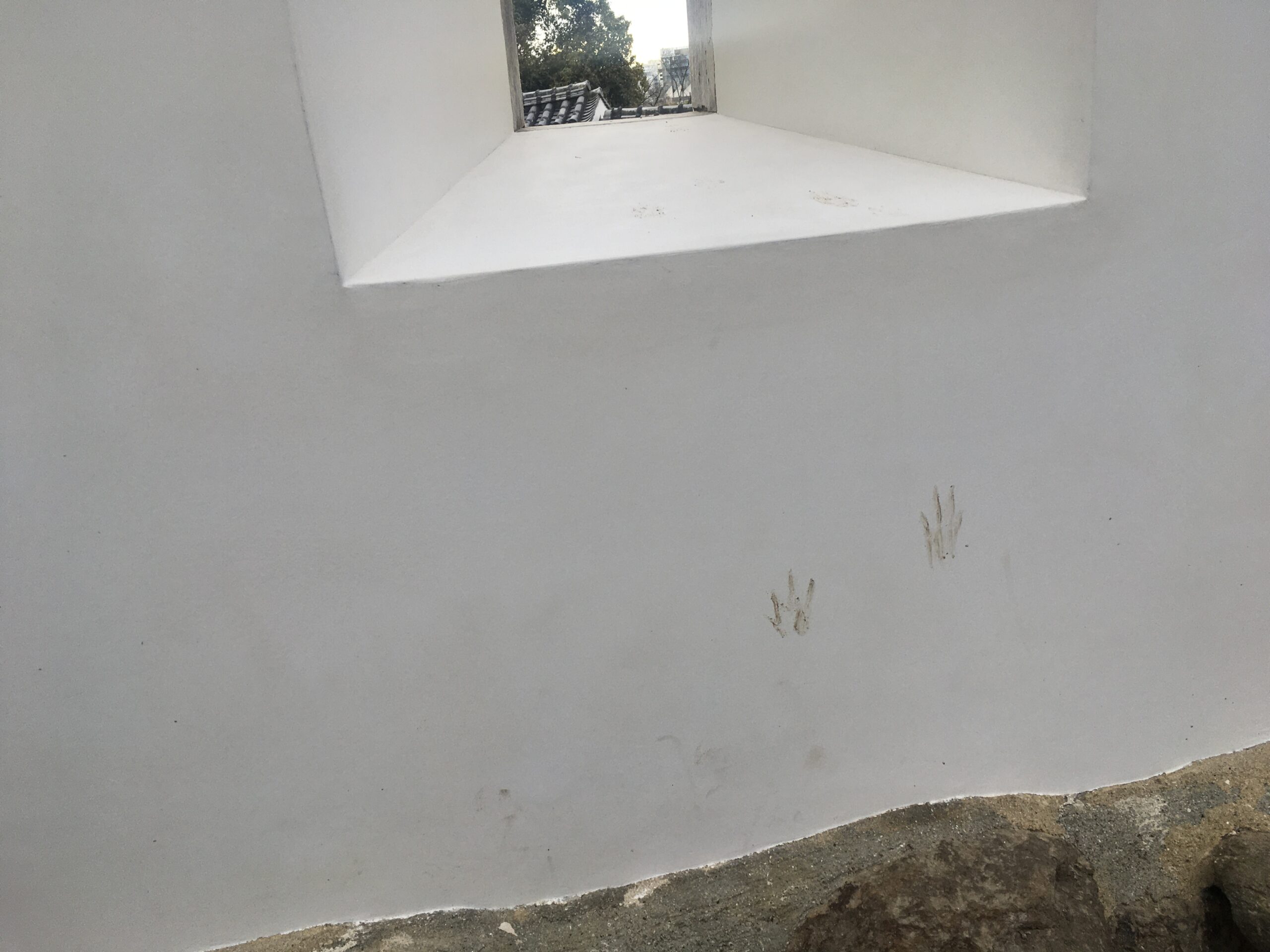 2024年2月の事です。いつものように外国人を案内をしている時、ふと漆喰工事が終わったばかりの真っ白な土塀を見ると、写真の様な汚れに気付きました。誰や汚したのはと思ってよく見るとどうも動物の足跡みたいです。タヌキかイタチかアライグマかそれともキツネでしょうか?