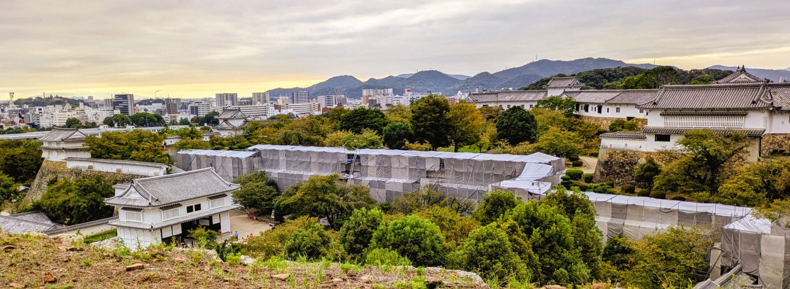 写真は大天守見学後、備前丸への階段からの1枚。菱の門とネットに覆われた、長〜い「ろの門西南方土塀」が見えます。(KR)