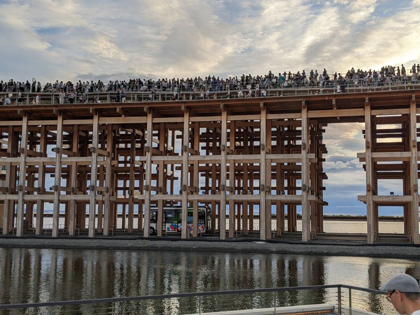 特に、見とれたのは、夕方ウォータープラザで行われるスペクタクルショーを上から見ようと大屋根リングのスカイデッキ南側に続々と集まった人々の眺めでした。