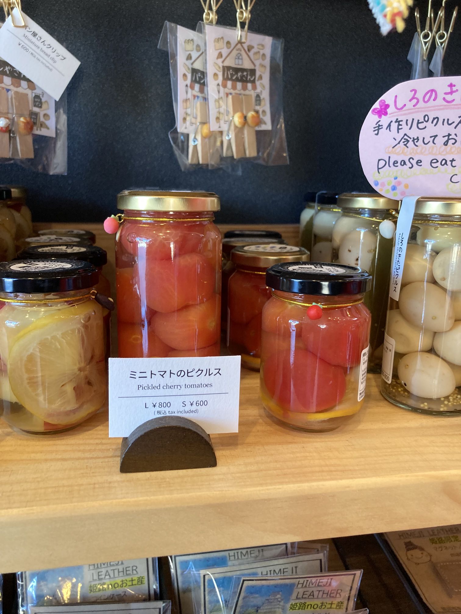 前回、姫路のおすすめとして、まねきの「えきそば」を紹介しました。先日、お城ガイドを終え昼食にその「えきそば」を求めてお城堀端のまねきのお店を訪問。すると、素敵な出会いが待っていました。入口を入ってすぐ左の棚にピクルスの小瓶が。商品名は「しろのきたピクルス」。その蓋には姫路城のお洒落なデザイン、瓶には可愛らしい野菜のオブジェ。お酒のお供にと一瓶購入しました。