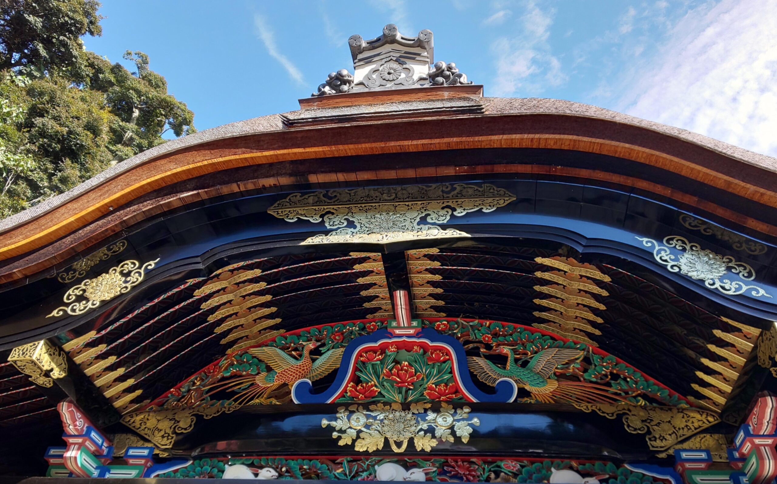 このたびスマホの写真フォルダを探したらこれまた豪華な蟇股がありました。修復後間もない頃に行った、宝厳寺(琵琶湖の竹生島)の唐門、深紅の牡丹が彫られた青い蟇股です。(KR)