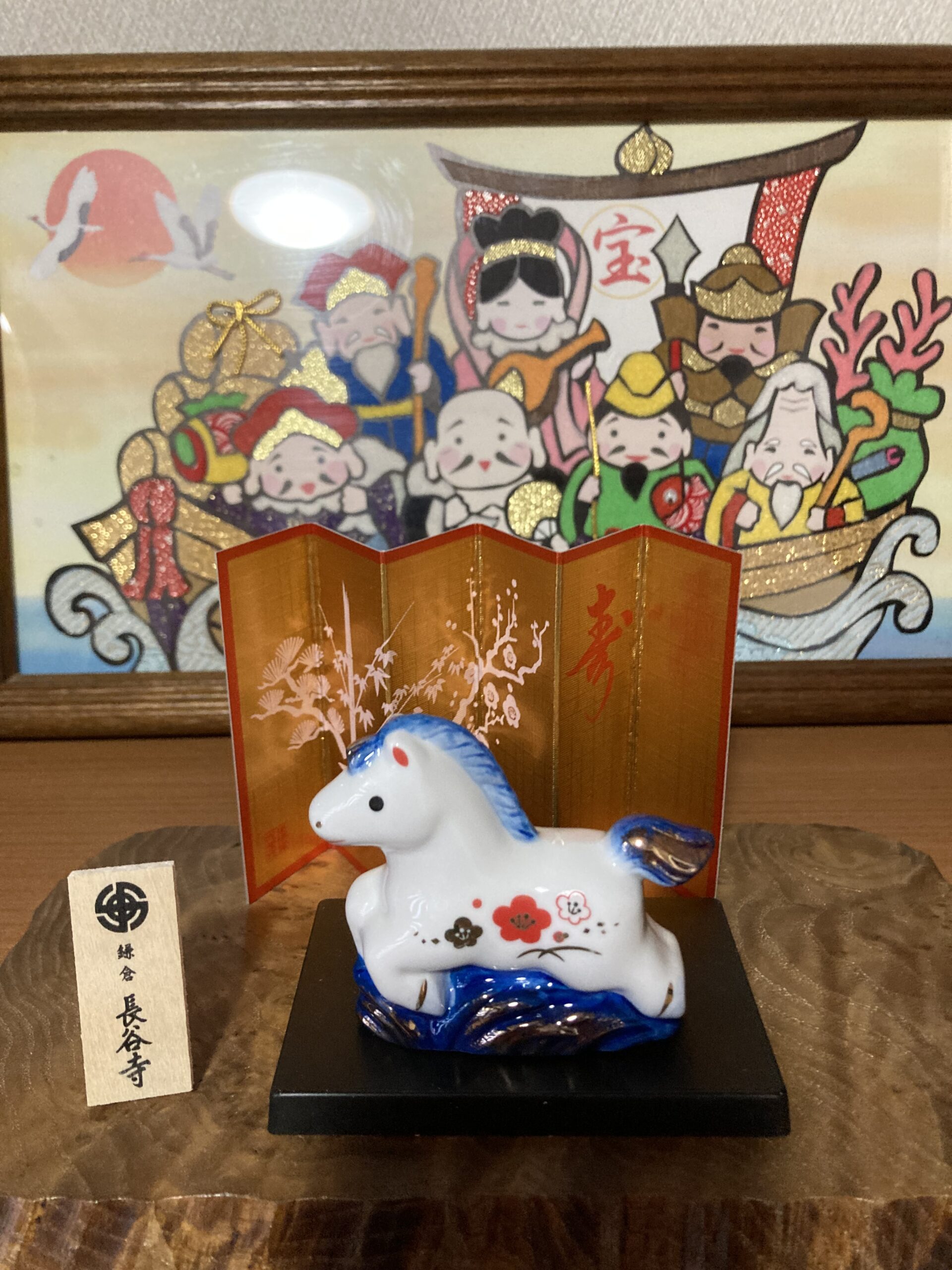 今年は60年に一度の丙午(ひのえうま)。馬は私の一番好きな動物で、亡き父の生まれ年でもあるので、何かいい事あるかなぁと勝手に期待しています。そして1月初旬に訪れた鎌倉の長谷寺で可愛い馬の置物を見つけたので購入。七福神とともに我が家の玄関で守ってくれています。