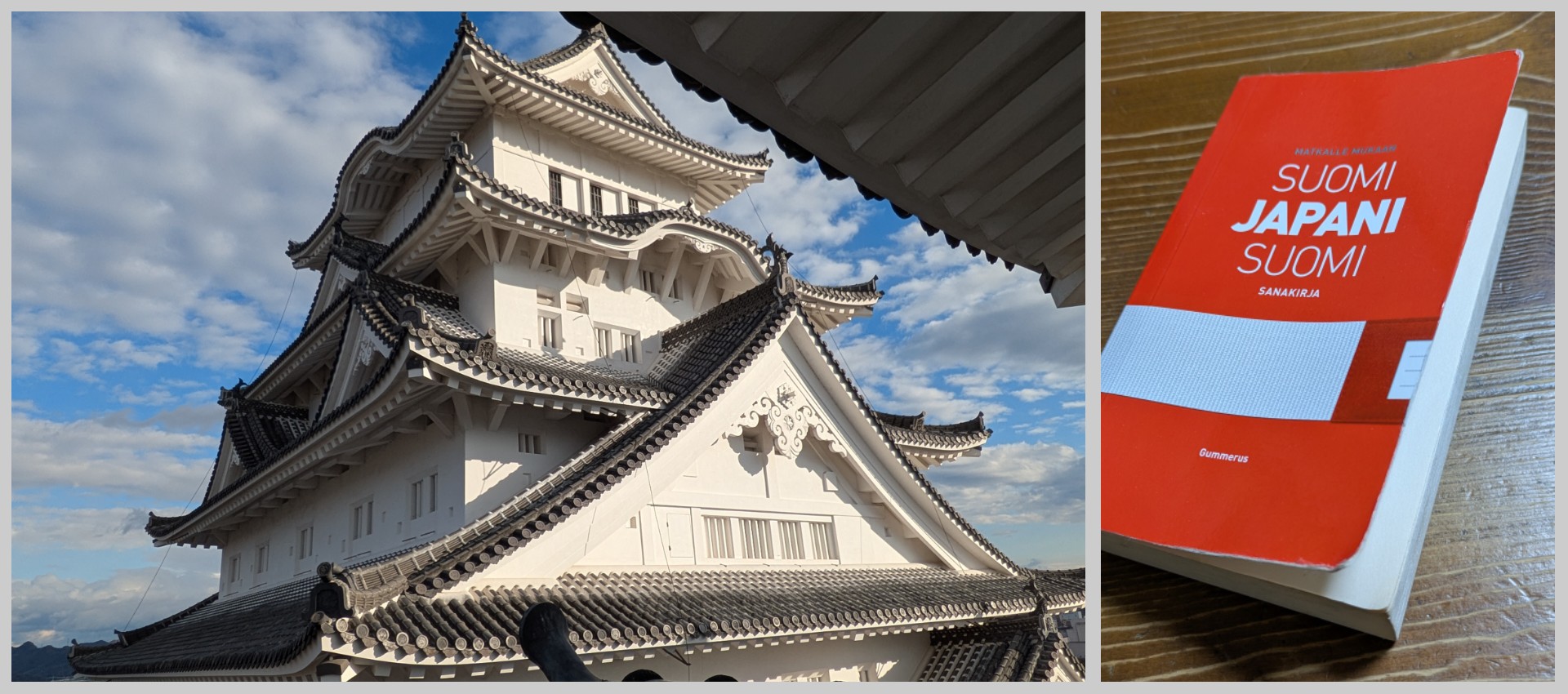 さて、右側の赤い表紙の本は、フィンランド語で引く日本語辞書です。同じ本を2冊持っているからと別れ際に私にプレゼントしてくれました。ガイド中のおよそ3時間、二人とも表情はずっと堅かったのですが八方正面の姫路城を気に入ってくれた証として謹んでいただきました。時おり、彼らが姫路城のことを思い出してくれていたら本望です。(KR)